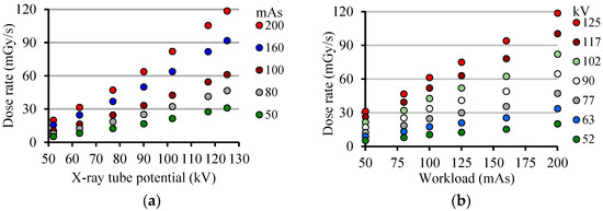 Dose rate at 32 cm from the X-ray focus as a function of: (a) kV; (b) mAs.