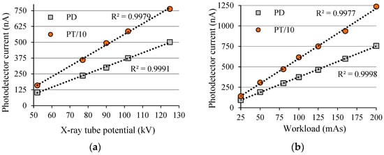 id of a photodiode (PD) and a phototransistor (PT), irradiated simultaneously positioned together (at 32 cm), as a function of: (a) X-ray tube potential at 100 mAs; (b) Workload at 102 kV.