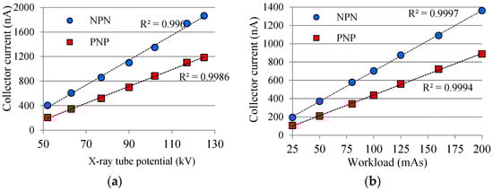 If the data of Figure 17 are compared with the data of Figure 16, it can be seen that the basic difference is the sensitivity of each photodetector (PD and PT) used for measuring the signal produced by the interaction of radiation on the device. Similar data were previously presented by Valença [36], however the X-ray generator equipment was not one for use in a hospital. Actually, Valença’s experiment was done with metrological equipment, a Pantak HF-320, which has a constant electrical current IXRT and also an electrical potential (kV) with a very low ripple, i.e., very high precision X-ray generator equipment. Figure 18 shows graphs of device current id (in this case ICX), as a function of two X-ray tube parameters (kV; mAs) for a complementary pair of BJTs: (1) ZTX851 (npn) with β ≈ 178; (2) ZTX948 (pnp) with β ≈ 113. Such devices are referred to as big chip BJT [37,38]. It can be noted that, like the ion chamber and photodetectors, the linearity of the collector current ICX is a function of the two X-ray tube parameters (kV; mAs). Actually, the linearity of the response of an electronic sensor is no longer important (for at least 40 years) after the invention of the microprocessor, which can be programmed for measuring any function (exponential, polynomial, etc.).
