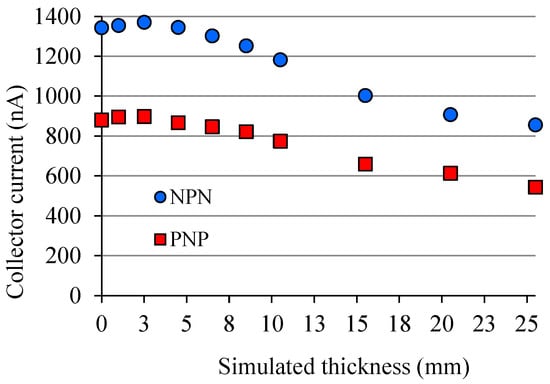 Looking at the graph in Figure 20, it can be seen that the curve shape of each BJT is very similar regardless of the gain and polarity of each one. That is, the ICX current increases with the increase in the thickness of the simulated package and then from tp ≈ 4 mm onwards ICX starts to decrease. The difference in the Alves’ result and those in Figure 20 is that the BC846 device used by Alves [28] has a SOT-123 SMD package, which is about 1 mm thinner than the big chip BJT used here, then the difference in result was expected.