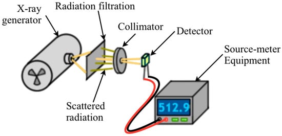 It must be evaluated whether scattered radiation far from the device can be significant in the radiation measurement procedure with BJTs. Such an evaluation can be important if the device is used to measure only primary radiation (e.g., non-invasive kV measurement). One way to analyze such an effect is to place a radiation filtration plate at a distance from the device (Figure 21). By placing a collimator between the plate and the device under radiation, it is possible to verify how much the scattered photons on the plate are measured or not by a BJT. Such an experiment can be performed by varying the area of the collimator for measuring how ICX varies as a function of collimation (Table 3).