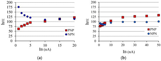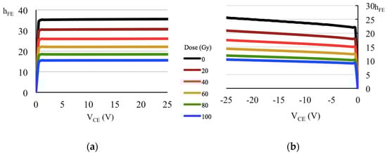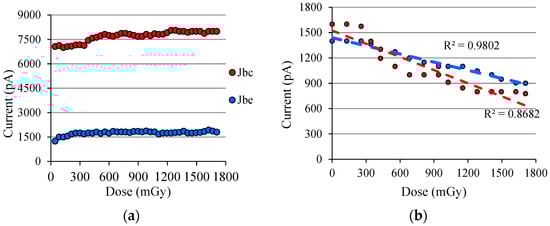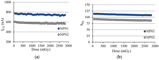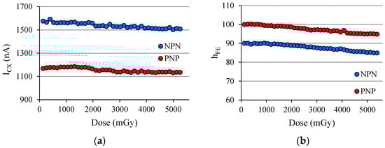 (a) ICX behavior of a complementary pair of BJTs during a sequence of 40 exposures to an X-ray beam with the parameters: 102 kV@200 mAs; (b) hFE behavior of the same pair of BJTs.