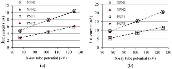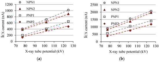 ICX for npn and pnp BJTs, irradiated simultaneously at the same position (32 cm), as a function of: (a) X-ray tube potential (kV@200 mAs); (b) Workload (mAs@102 kV).