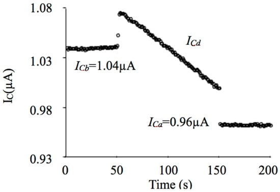 Some authors formulate the effect of BJT gain degradation as the decrease in collector current with the increase in some component of the BJT base current (Equation (1)), which is commonly called excess base current [50,51,52,53]. Also, Equation (2), which presents some variables or parameters of the device, can be (for a certain type of radiation) the source of variation of the BJT gain. However, for simplicity, such an analysis is not adequate here. Taking into account that IB is kept constant, it will be assumed that the damages produced by radiation on the BJT, in all parts of the device, lead to a decrease in the gain and consequently in the collector current. In a practical way, one can didactically say that the irradiation of diagnostic X-ray beams in the BJT changes the electrical state of the device, and one way to determine its new electrical state is to measure hFE (or IC), for example. Looking from the point of view of the inverse problem, by measuring the new electrical state of the device one can then determine the radiation dose received by the device, which was a suggestion given by Monte [46,47].