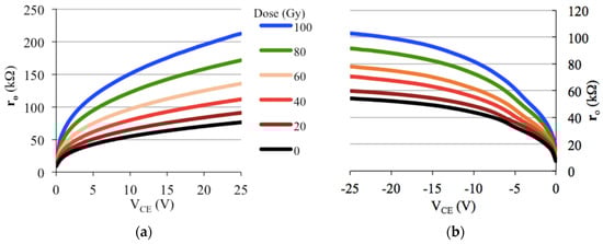 From the last result, in a practical and didactic way, one can say it is the parameter hFE of the transistor which systematically decreases with the accumulated dose of X-rays in the energy range used in medical diagnosis, as can be seen in Figure 27. This experiment consisted in reproducing the technique used by Monte [46,47] to measure the gain hFE and the output resistance, ro, of a complementary pair of BJTs (TIP 41 and TIP 42), nominal hFE ≈ 30 [48,49]. The experiment was performed with the Pantak HF-160 X-ray generator (100 kV@10 mA; 1 mm Al radiation filter), which can bombard the device with X-ray photons continuously since it has a coolant for continuous cooling. Figure 28 shows that ro increases after the accumulated dose up to 100 Gy on the devices. Other authors [42] also report an increase in the collector resistance, which is ro, assuming the small-signal equivalent circuit [10,46] that is due to radiation-induced defects in the semiconductor region corresponding to the collector. Table 8 summarizes the behavior of the parameters hFE and ro (for |VCE| = 25 V) on the complementary pair of BJTs, parameterized with the accumulated dose of an X-ray beam in the energy range of the diagnostic: the BJT gain decreases whereas the output resistance increases.