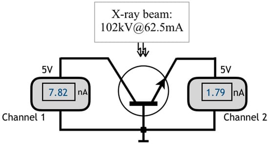 Circuit used for a reverse biased JBC and JBE irradiation procedure to analyze how the transistor behaves during 40 exposures with X-ray tube parameters selected to be 102 kV@100 mAs.