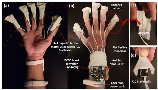 Untethered high-resolution haptic hand wearable having 80 tactile actuators (tactors). There is a 4 × 4 matrix of tactors on each fingertip made from Metec P20 Braille cells. The prototype has an open-backhand and open-palm design for easy hand tracking. (a) Open-palm view, (b) open-backhand view, (c) side view of the fingertip tactile matrix with an invisible rubber band to increase the grip of the nail clip if the user has a small or thin finger, and (d) 4 × 4 fingertip tactile matrix made from two P20 Braille cells.