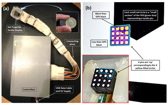 In our initial studies in 2020, we demonstrated a 4 × 4 fingertip tactile matrix display that can be strapped on a finger [48], as shown in Figure 3. It is made from commercially available dot Braille cells [55]. Our previous prototype has a 1.08 cm surface area, a pin pitch of 2.6 mm, and uses a 5 V DC supply, but it is bulky, with its control box containing the microcontroller circuitry, as shown in Figure 3a. Each tactile pin is a small solenoid that controlled by a microcontroller with an h-bridge motor driver. The tactile matrix actuator is connected to a tactile matrix simulator, as shown in Figure 3b, that scans binary images and uses a Canny edge algorithm for edge detection. Sixteen regions of interest (ROIs) form a 4 × 4 matrix in the simulator that corresponds to the 16 tactile actuators. The integration of the hardware prototype and the tactile matrix simulator allows the user to feel the surface or the edges of binary image as the scanning ROI moves across the computer display.