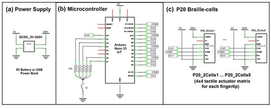 Whole system schematic of the untethered high-resolution haptic hand wearable: (a) power supply block, (b) microcontroller block, and (c) P20 Braille cells block.