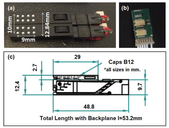 P20 Braille cell. (a) The 4 × 4 matrix from two pieces of P20 Braille cells, (b) two-position backplane for two P20 Braille cells, and (c) P20 side-view dimensions [49].