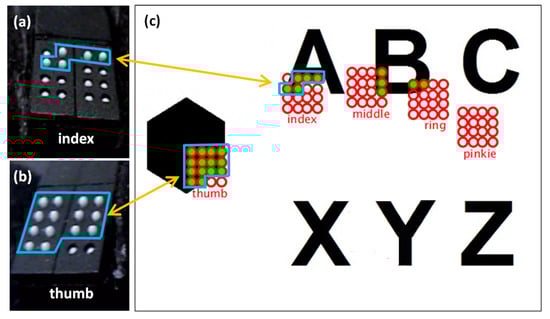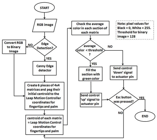 In this study, we used Processing software to develop five 4 × 4 matrices for the tip of every digit of the hand, as shown in Figure 7. Each 4 × 4 matrix has 16 small sections corresponding to the 16 tactile pins of each P20 Braille cell. Figure 7a,b show the actual tactile pins activated for the index finger and thumb matrices corresponding to the green circles in the index and thumb matrices of the GUI shown in Figure 7c. Each matrix can hover to an image on the computer screen using the Leap Motion Controller. The tactile matrices in our simulator can be grouped and be moved using a computer mouse using the coordinates of its pointer as a reference. The tactile matrices can also be anchored on the fingertips and wrist coordinates extracted in real-time by the hand-tracking algorithm of the Leap Motion Controller. Each small section in every tactile matrix simulator is an ROI that computes the amount of black or white pixel. The simulator can be used to scan the surface or the edges of binary image using the Canny edge detector algorithm. If the small section of the tactile matrix simulator is more than 50% black, it will be filled with the color green, and an “on” or “up” signal is sent by the microcontroller to the assigned tactile pin. On the other hand, if the small section is less than 50% black, an “off” or “down” signal is sent by the microcontroller to pull down the assigned tactile pin. The flowchart of surface scanning and edge detection algorithm is shown in Figure 6.