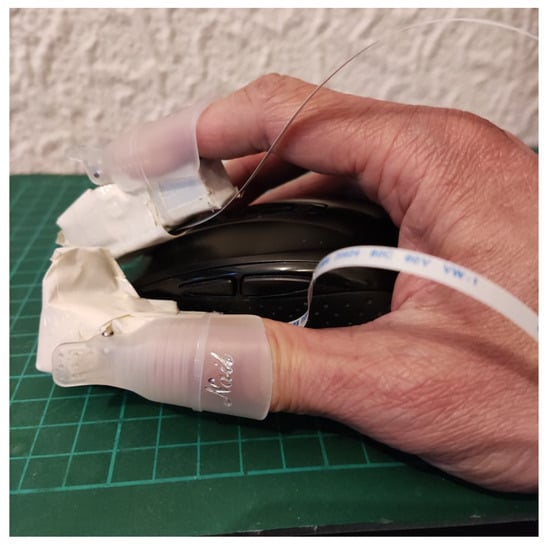 Our untethered high-resolution haptic hand wearable with detailed parts is shown in Figure 2b. Each fingertip module has a nail clip for easy mounting on the fingertip and a small clear rubber band, as shown in Figure 2c, to increase the grip if the user has a small or thin finger. In our prototype, the use of a nail clip and a small rubber to fit our fingertip module securely to any size and shape of a fingertip is much simpler compared to the method of personalizing a wearable for target fingertip by taking into account its specific geometrical characteristics as well as some target performance metrics made by Malvezzi et al. [50]. The exposed 4 × 4 matrix made from two P20 Braille cells is shown in Figure 2d. The components or modules in our prototype are connected or combined using sockets and detachable cables. We used thin and light-weight flat flexible cables (FFC) in connecting our fingertip modules to the control board. Depending on the application, we can reduce the number of fingertip modules. For example, a pinching application needs only two fingertips (index and thumb), while grasping needs five fingers. This modular property adds to the novelty and flexibility of our prototype for easy mount or replacement of parts. The connecting cables are flexible enough to allow the fingers to flex, allowing a grasping hand gesture.