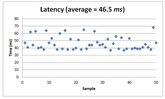 An average of 46.5 ms latency was measured from 50 samples.