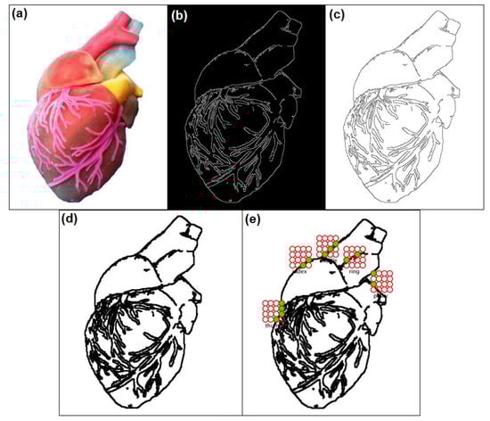 Edge detection using Canny edge algorithm with Hough transform to thicken the lines. (a) RGB image of a heart, (b) Canny edge result (white lines in black background), (c) inverted Canny edge, (d) thickened Canny edge using Hough transform, and (e) edge detection with tactile matrices simulator.