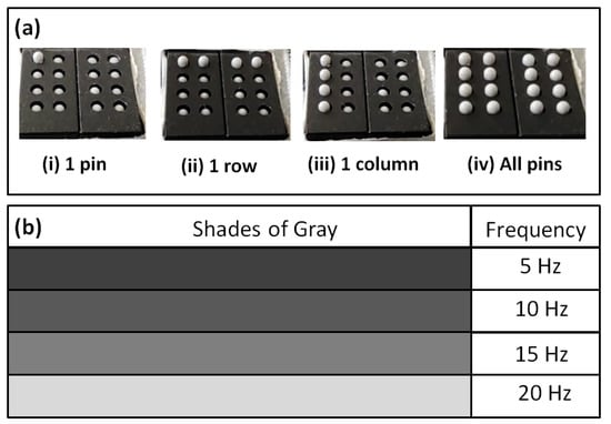 Moreover, instead of directly programming the pins to vibrate at a specific frequency, we can use another parameter that will dynamically change the tapping frequency. Different tapping frequencies can be assigned to various shades of gray, as shown in Figure 12b. As the ROI in the tactile simulator moves across a grayscale image, the tactile actuator is activated with the corresponding tapping frequency. The actual tapping test videos can be found in this link [68].