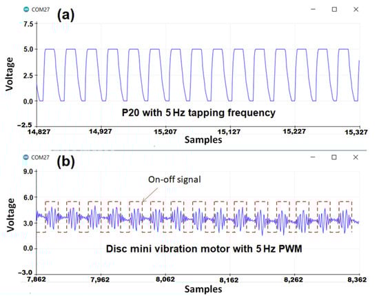Tapping vs buzzing vibration. (a) Tapping: 5 Hz vibration has clear and distinct vibrations. (b) Buzzing: The low-frequency 5 Hz on–off signal for the vibration motor (in red dotted lines) has a high-frequency buzzing vibrations (in blue spikes). The inherent high-frequency vibrations within low-frequency on-time is due to the rotating mass inside the vibration motor running at 14,000 rpm or around 230 Hz.