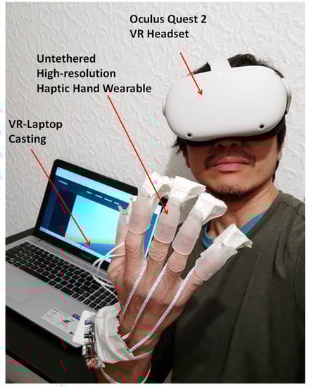 Our high-resolution haptic wearable can be connected to an Oculus Quest 2 VR headset using a Bluetooth connection, and the VR environment can be cast on a laptop, as shown in Figure 14. The 3D virtual objects are developed using Unity software. Unlike the open-palm setup in Figure 8 where the Leap Motion Controller hand tracking device is at the bottom, the position of the control circuit of the haptic wearable was placed on the wrist so that the Oculus Quest 2 VR headset can track the back of the hand.