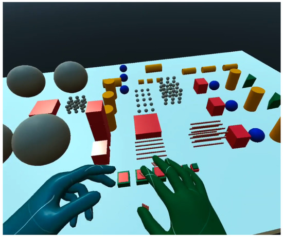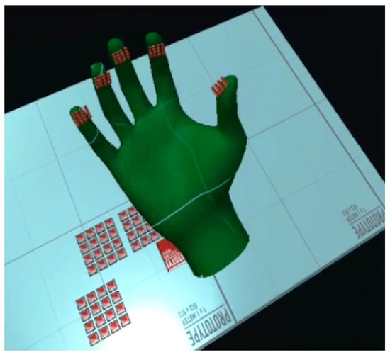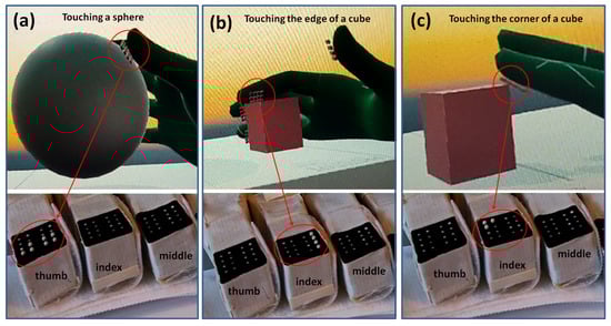 Similar to the 2D tactile matrix simulator, we created a 3D tactile matrices simulator, as shown in Figure 15. The basic idea is to create a group of 4 × 4 button switches and attach it to each of the fingertips of the VR hand avatar. A tutorial on how to create a simple VR button switch can be found here [70]. We created a 3D environment, as shown in Figure 16, where we can explore the shapes and edges of 3D VR objects. Each button switch on the fingertip of the 3D VR hand has a script that sends a signal to the corresponding hardware actuator during VR object collision, as demonstrated in Figure 17. The binary scale of either high or low pin actuation was presented and demonstrated to feel the contours of 3D VR objects as shown in Figure 16. The participants felt basic contours such as a sphere, edge, and corner of a cube in the 3D screen, as shown in Figure 17, when they wore the Oculus Quest 2 VR Headset. The actual 3D VR test videos can be found in this link [68].