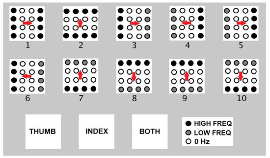Another advantage of our prototype is that it can produce tapping or linear vibration on the fingertips. The tactile pins of P20 Braille cells can be activated in a tapping manner and controlled using a pulse signal at different frequencies and duration. We tried vibrating the tactile pins using 5 Hz, 10 Hz, 15 Hz, and 20 Hz frequencies, which are within the range of frequencies that triggers fingertip’s tactile mechanoreceptors: Meissner’s corpuscles and Merkel’s cells that are sensitive to edge pressure and flutter tap as reported by Visell [19]. Our prototype can produce point tapping by activating one pin, line tapping by activating a row, a column, and area tapping by activating all the pins in the 4 × 4 fingertip tactile matrix as shown in Figure 12a(i–iv), respectively.