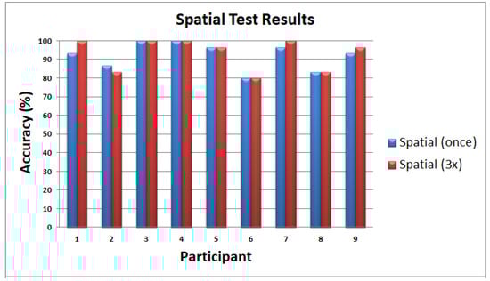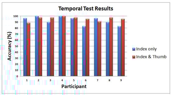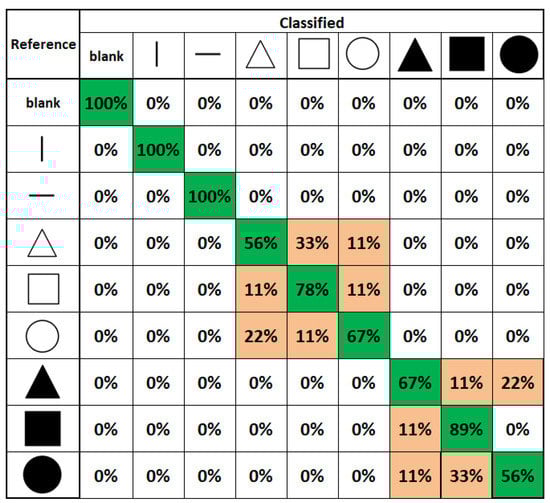Using the index finger and thumb, all the human participants in the 2D scanning test were able to distinguish an empty/blank box, a vertical line, and a horizontal line, as shown in the confusion matrix of Figure 26 with 100% accuracy. Moreover, participants were able to achieve a higher detection rate of 89% and 78% in detecting plane and edge square, respectively. The lowest accuracy is 56% for edge triangles, confused mostly with edge squares. We also obtained a 56% average accuracy in recognizing plane circles that confuses mostly with the plane square, not with vertical or horizontal lines or blank squares. However, the authors argue that given the higher accuracy percentage values, humans need to be trained for our novel wearable to achieve techniques in recognition, as naive participants’ recognition values are promising. Since surgeons are trained for surgeries, this system would be easily adapted to enhance techniques in laparoscopic surgeries. Furthermore, these 2D scanning test results show that our prototype can be used as a vision substitution device as well. On average, the exploration time to complete the 2D scanning test is 4 min and 11 s with an SD of 32 s. The exploration time during testing is twice the training time.