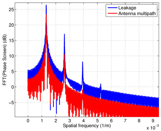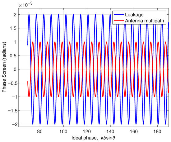 Figure 4 shows the effect of RF leakage and antenna multipath as a function of ideal phase () on the interferometric phase for the SWOT geometry and Figure 5 shows the spectral components of interferometric phase for both cases. The two cases appear to have similar shape (albeit out of phase) and contain the same spectral signatures. For SWOT, this scenario is unlikely as the two antennas are obscured by the payload module.