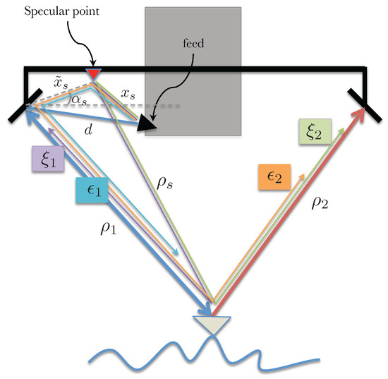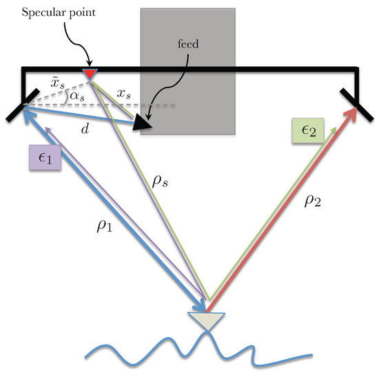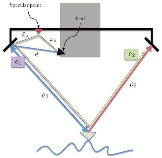where d is the distance between the transmit feed and the transmit side reflectarray, is the distance between the specular point and the transmit reflectarray and is a phase term introduced by the specular point (this additional phase term is expected to be a function of the look angle). Note the factor of 2 next to is due to the two equivalent signal paths, one where the specular point acts as the transmitter and the reflectarray as the receiver and the second where the reflectarray transmits and the specular point acts as the receiver. The range of the imaged object from the specular point and the reflectarrays are and (for , i.e., the left and right reflectarrays), respectively. Assuming , the interferometric measurement can be written as