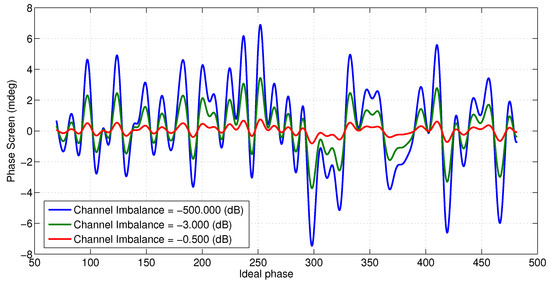 Expected phase screen for 67 dB signal to multipath ratio and varying channel imbalance with specular points spread evenly along the mast.