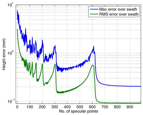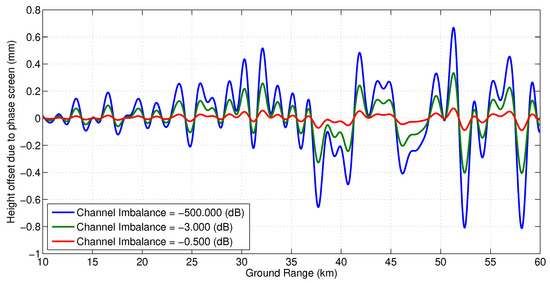 Figure 9 and Figure 10 show the effect of channel imbalance on the phase screen amplitude and height bias, respectively. Here, channel imbalance refers to the difference between the amplitude of the multipath signals received at the two channels, i.e., . Figure 11 shows two statistics, the maximum height error in the swath and the total RMS height error across the swath as a function of varying number of specular points along the 4.3 m mast (spaced evenly) for an amplitude to multipath ratio of 57 dB.