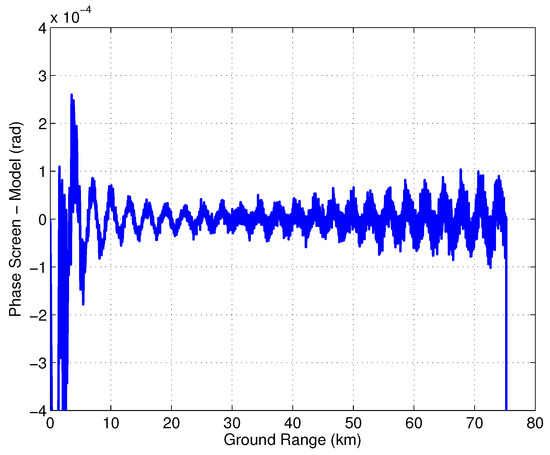 It is hard to fully verify multipath models; however, some select cases can be looked at as a verification of the general framework. Here, we simulate two cases using the SWOT raw data simulator [30]. In the first case, a specular point as a second transmit reflectarray (similar to the case described in Section 3.2) is simulated by running two separate simulations, one with the regular SWOT geometry and the second with the transmit antenna at the location of the specular source. The received voltage for the second case is scaled to −57 dB below the voltage level of the simulation with regular SWOT geometry, i.e., multiplied by a factor equal to . The two received voltages are then simply added together. The phase screen model for this case can be written (similar to (17)) as