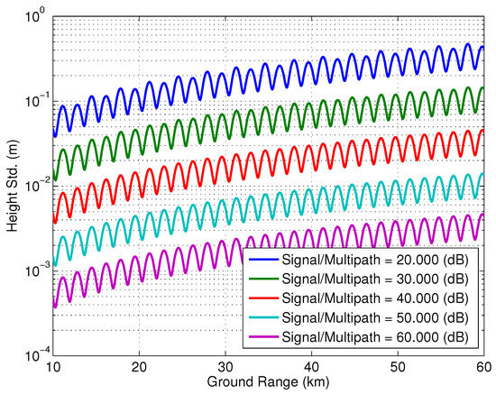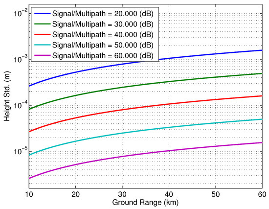 where . Multipath phase in this case will be constant across swath, while the amplitude will depend on the difference between the received multipath voltages and location of the specular point. This particular type of multipath scattering is preferable for SWOT since the cross-track variation is negligible and therefore more amenable to calibration than the scenario outlined in Section 3.2.