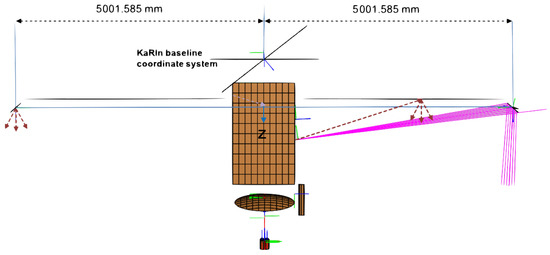 The SWOT observatory, as seen in its deployed configuration in Figure 1, consists of a payload module containing the radar and subsystem electronics, the nadir module with nadir altimeter and radiometer antenna and solar arrays oriented perpendicular to the KaRIn 10 m interferometric baseline. The two rectangular Ka-band reflectarray antennas [20] ( m) are mounted at the ends of two rigid masts, each approximately 4.3 m long. The two masts and reflectarrays are folded and stowed during launch and deploy once the spacecraft is in orbit [21]. Each reflectarray illuminates two swaths on either side of the nadir track by creating two beams using vertically displaced H- and V-polarized feeds located in the payload module, approximately 4.3 m from the reflectarrays. The centimeter scale sea surface height estimation requirement translates to very strict constraints on distortion of this structure (on the order of tens of microns). Consequently, the KaRIn mechanical structure is designed to be very rigid [20,22] and insulated from the environment using multi-layer insulation (MLI). MLI unfortunately is highly reflective at Ka-band frequencies and can change shape appreciably with temperature.