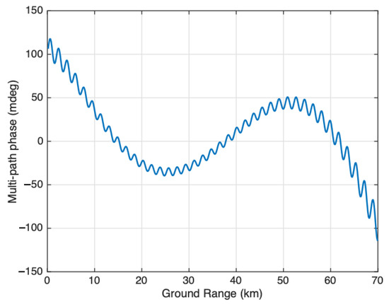 where . Multipath phase in this case varies across swath as a function of the look angle, mostly sinusoidally, with its frequency depending on the distance of the scattering point from the antenna (longer distances leading to higher spatial frequencies). The amplitude of the phase screen here is dependent on the difference between the received multipath voltage at the two antennas.