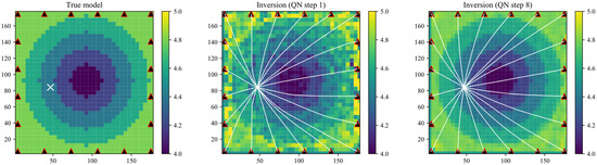 Tomography inversion involves solving the physical relationship between the velocity and anisotropy (E) structure as well as the measured arrival times. Following the fast-marching algorithm, we defined the velocity and anisotropy structures along a regular orthonormal grid with relatively coarse spacing. The horizontal P-wave velocity (Vh) structure is solved using the fast-marching method by tracing rays within a linearly refined grid. The iteration starts with the sensor locations, the prior source locations, the arrival times from surveys and sources, the prior Vh model, and the prior E model. In order to limit the iteration range and increase the calculation speed, the grid refinement factor, the quasi-Newton step size, the maximum number of iterations, and the standard deviations on Vh and E, arrival time picks, source locations, and source origin times need to be set in advance. Figure 1 shows a synthetic example of an anisotropic model inversion. The white cross in Figure 1 shows the position of the event, and the red triangles shows the sensors. The left plot in Figure 1 shows the true model, based on which we generated the synthetic arrival times. The model was divided into a 36 × 36 coarse grid spacing. We used an isotropic model with the average velocity of the true velocity structure as the prior model. The middle plot in Figure 1 shows the inversion at the first quasi-Newton iteration. The right plot shows the tomography results at the 8th iteration step. The white lines indicate the rays from the source to the sensors at the corresponding resolved velocity model. The rays were traced by a refined grid with a factor of 10.