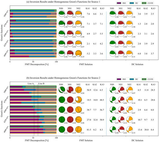 The inversion was performed in the time domain and the results are shown in Figure 3. The inversion was restricted to DC solution and FMT solution separately. The NS0, NS1, and NS2 indicate noise free, noise scale 3 × 10−7, and scale 6 × 10−7 respectively. The KA1, KA2, and KA3 indicate the Kagan angel of the solution to the real fault planes under corresponding noise levels. The dotted line A and line B in the FMT decomposition indicate the real ratio of the ISO component and the DC component. The black solid lines in the FMT beachballs show the decomposed DC solution. The numbers in the lower right corner of the beachball indicate the inverted moment magnitude.
