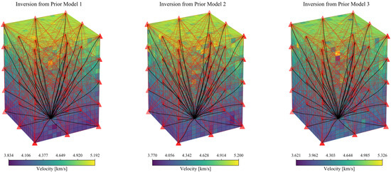 Tomography results with the three prior models. The red curves indicate the rays of active measurements which providing paths with definitely source positions. The black curves represent the ray path from the source to the sensors. The red triangles indicate the sensors.