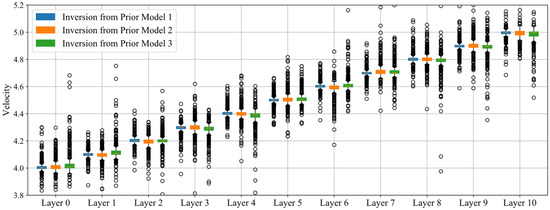It can be seen from Figure 5 that the inversion results all match the actual situation. Moreover, the topper the structure, the greater the velocity. The tomography result of the inversion from Prior Model 1 is the most accurate, and the overall resolved velocities are concentrated with 3.834 km/s to 5.192 km/s. As the prior model becomes rougher, the inversion results become more discrete and the overall error of the inversion result grows. In order to analyze the accuracy of the resolved velocity at each node, we divided the model every 0.64 m in the vertical direction, and then counted the solution distribution by layer. The statistical results are shown in Figure 6. The layer ranges (m) specified for Figure 6 are listed in Table 3 and the standard deviation in different layers are listed in Table 4.
