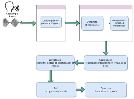 The emotional speech recognition method analyzes speech for the presence of emotions. The proposed method first assumes signal recognition, detection of speech in it, recognition in simplified transcription, definition of word boundaries, comparison of simplified transcription with a code book, and a hypothesis about the degree of emotionality of speech. In case of the presence of emotions, there occurs a full recognition of words and detection of emotions in speech (Figure 1).