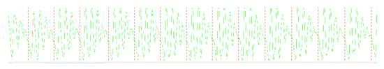 This figure demonstrates vertical marks placed by a program that calculates successive quasi-periods according to the following algorithm.