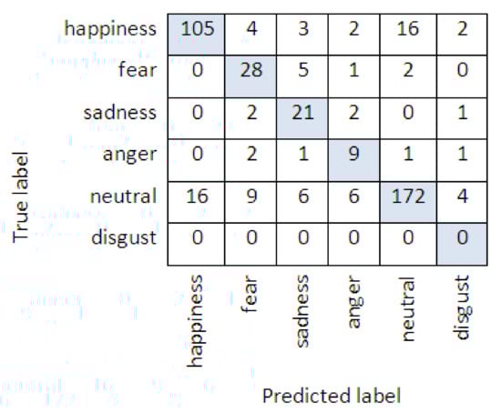 With the proposed Emotional Speech Recognition Method, we reached an accuracy of 79.7%. According to the results of the experiment, 105 students who received the expected good grade expressed happiness; there were students who were afraid during the exam or worried, and 28 were classified as fear. Further, after the output of the exam results, students clearly expressed sadness and anger if they did not obtain a good mark on the exam. During the experiment, the proposed recognition method confused the classes of fear, sadness and anger emotions. This was due to the semantic proximity of the used emotionally colored words. Moreover, 172 students were assigned as neutral, since they did not voice their reactions. In view of the fact that during the computer test, students did not speak much and did not express emotions much, the emotion classes proposed in Table 4 were considered sufficient by the authors of the article.