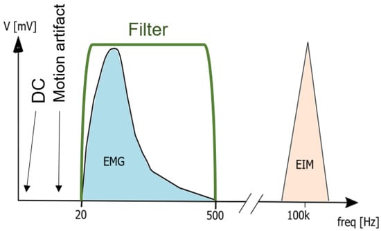 The EIM system developed in this work will focus on measuring the magnitude of EIM signal over a wide frequency range. While the most used frequency for the injecting current is 50 kHz, since it is more reactive in biological tissue [33], we use currents with frequencies between 2 and 200 kHz to assess the condition of the muscle. The use of amplitude-modulated current at high frequency to investigate human muscle contraction reduces the effect of motion artifacts, which are in the frequency range from 10 to 100 Hz [34] (see Figure 1). Consequently, the combination of EMG and bioimpedance detects the muscle contraction more reliably [27,29].