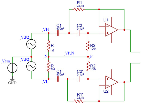 The high-pass filter used for this system is based on the fully differential active filter with a Sallen—Key topology proposed by Massarotto et al. [37]. This filter, depicted in Figure 5, was modified to meet the requirement for the lower cut-off frequency ( Hz). The resistors and capacitors used for this filter have tolerances of and , respectively. Moreover, the filters are powered with a split-rail converter TPS65133 (Texas Instruments, Dallas, TX, USA). This chip is based on a boost converter that creates a split-rail voltage of ±5 V. The low-pass filter for the EMG signal is a simple RC full-differential passive filter of order 1 and is depicted in Figure 6.