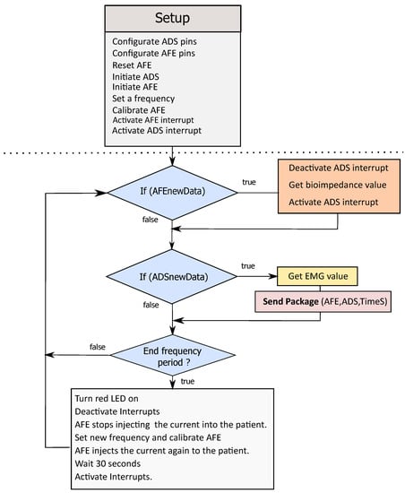The micro-controller CC1310 (Texas Instruments, Dallas, TX, USA, programmed with Energia) controls the system’s processes. To control the EMG and EIM module and reduce the program’s complexity, we wrote two libraries (EMG and EIM libraries) for the ADS1298 and AFE4300. After setting the register pins in the initialization step, the EIM module has to be calibrated using two calibration resistances, 200 and 20 , both produced by the company Vishay (Malvern, Pennsylvania, USA) with 1% tolerance. The raw value read by the AFE4300 at the calibration resistors is used to calculate the slope and offset of the linear calibration function. Figure 7 depicts the main program structure of the software.
