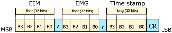 The data package structure in the RF transmission consists of the EIM, EMG, and time-stamp values separated by a comma character and CR character that ends the package. The values are split into four bytes. On the receiver side, the byte stream must be reconstructed. The receiver reads four bytes and combines them until it finds a comma character. The EIM and EMG result is reconstructed as a float type, and the time-stamp is reconstructed as a long type. This process is called serialization. Figure 8 shows the package structure for RF transmission.