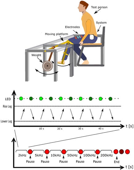 The test person sits on a chair with the leg attached to a mechanical rotating test bench where the rotation axis is located close to the volunteer’s knee. The test bench allows the volunteer to contract the muscle while raising the leg from an angle of 90 degrees to 140 degrees. The structure was weighted with 7 kg loads. The test person raises and lowers the leg 5 times by himself or herself within approx. 50 s with a signal from a LED (red/green). After a short break, the test will be repeated for another measurement frequency. The setup and the protocol of this measurement are depicted in Figure 10.