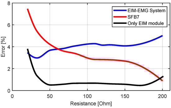 Percentage error of EIM module (black), EIM-EMG system (blue), and SFB7 (red) error respect to multimeter while measuring pure known resistances.