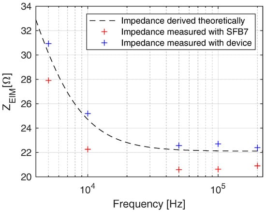 Figure 12 depicts the measurement results of the RRC network at 5, 10, 50, 100, and 200 kHz. The values measured with our device and with the SFB7 are shown in blue and red, respectively. It can be seen that our system outperformed the commercial SFB7 at all applied frequencies. The mean errors between theoretical and measured values are 2% measured with our device and 7.38% measured with SFB7.