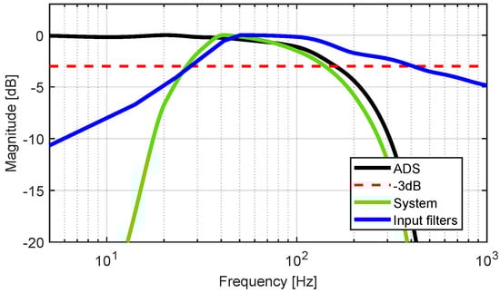 The frequency response of the combination of the filters is depicted in blue in Figure 13, where the lower cut-off frequency is 20 Hz and the upper is 320 Hz. It can be observed that the upper cut-off frequency is 150 Hz. This cut-off frequency is limited by the sigma-delta ADC built in the ADS1298 and can be raised by increasing the sampling frequency of the ADC. The frequency response of the filters in combination with the EMG module is depicted in green. The upper cut-off frequency of the whole system is Hz, and the lower is Hz.
