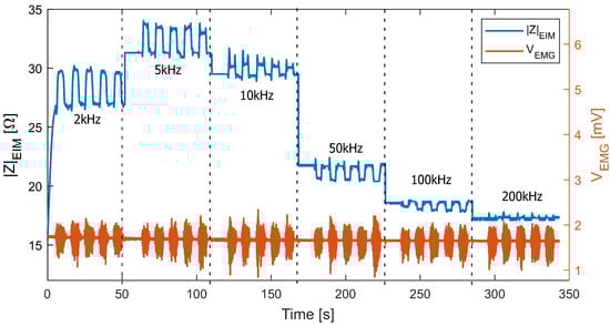The results of the test-bench test with 7 kg weight on a healthy volunteer are depicted in Figure 14. The change in EMG signal during muscle contraction and resting can be observed. The EIM measurement worked adequately at frequencies between 2 and 200 kHz.
