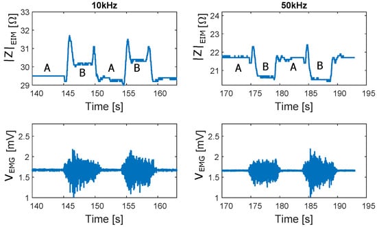 For a better illustration, Figure 15 shows a segment of the EIM and EMG signals at 10 and 50 kHz. A marked the 90° position of the leg (resting) and B marked the 140° position of the leg (holding 7 kg weight at maximum deflection). While no differences can be observed within the EMG signals, a switch of the relation between the EIM values at A and B for 10 and 50 kHz can be observed. During the transition from A to B and from B to A, which corresponds to the movement phases, peaks can be observed in the EIM signals.