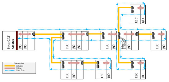 Communication using EtherCAT Device Protocol, which is typically simply called the EtherCAT protocol, is based upon a master–slave principle. However, in contrast to other master–slave communication networks (for example, the well-known Modbus communication network or Profibus, in which the master–slave principle is applied alongside the token passing mechanism between the master stations), the EtherCAT master station does not send separate datagrams that exchanges data with different slave stations using the request–response approach. EtherCAT datagrams contain processing data that propagates through all the EtherCAT slaves, which are called EtherCAT Slave Controllers ESC. This means that only one datagram is required for communicating with many ESC, which is then processed by the latter without the need for data buffering and storing. Therefore, minimal latency for the propagation of the datagram is introduced [20] and the exchange process for the input and output data becomes highly effective. In detail, when a datagram arrives at an input Ethernet port of a given ESC it is efficiently forwarded almost concurrently to its output port. The output dataset is extracted from the datagram “on-the-fly”; the input state is written similarly to the datagram.